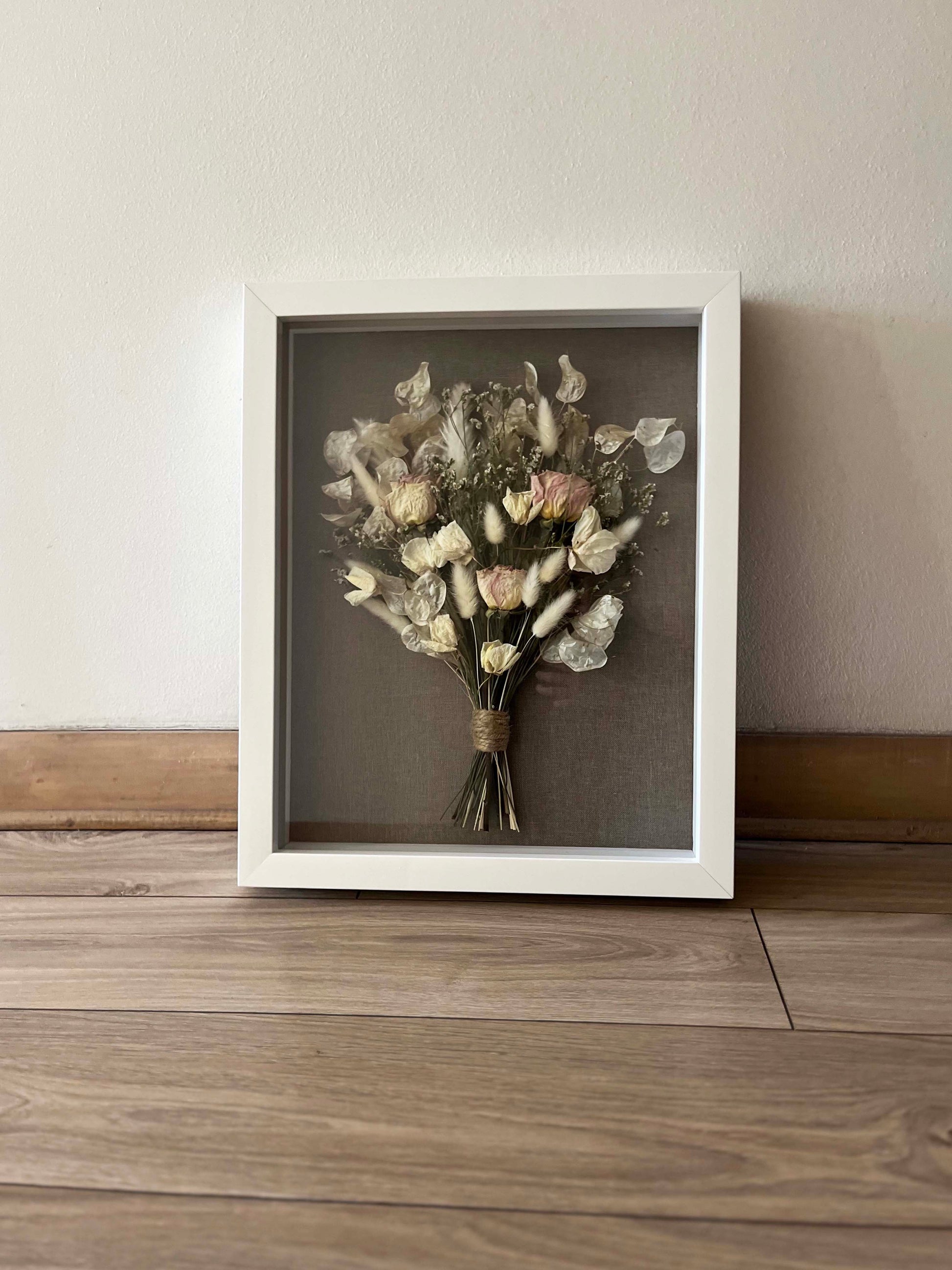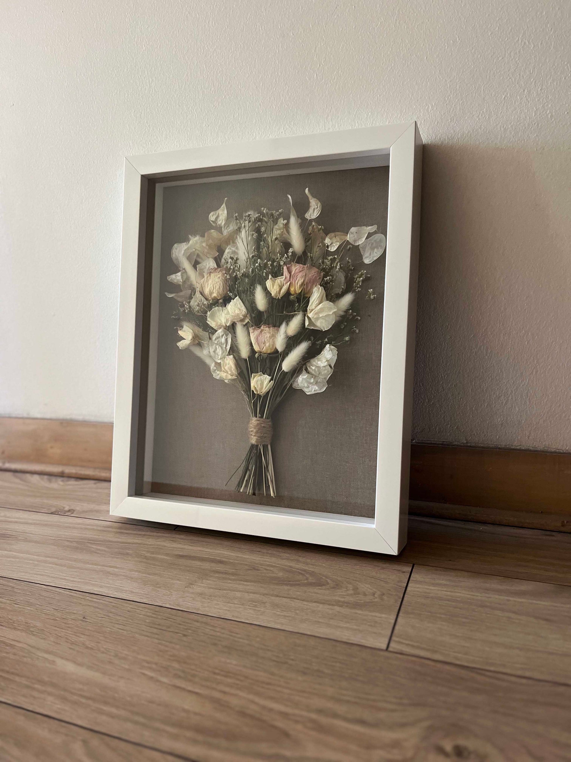 • La forma de tu ramo no va a cambiar, pero con el tiempo puede que notes cambios en el color. Por eso te recomiendo colgar tu cuadro evitando la luz directa y humedad.