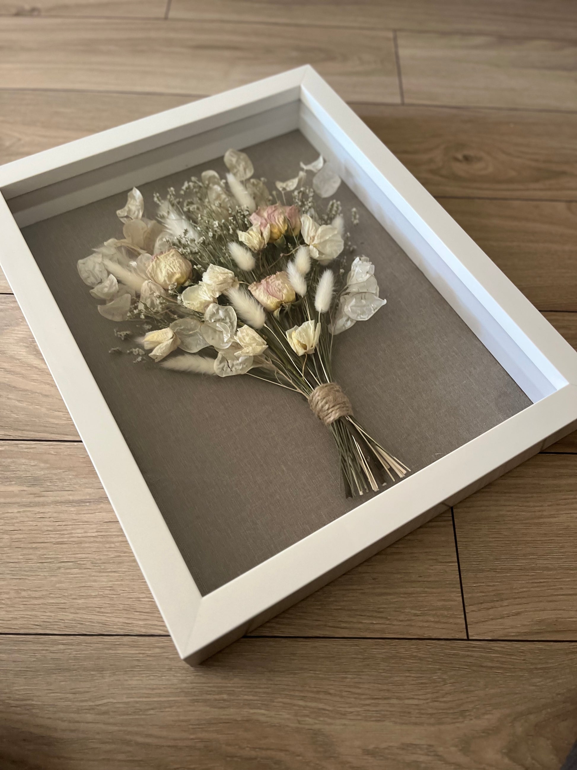 Nos demoramos aproximadamente 1 mes a un 1 y medio en secar y enmarcar tu ramo.