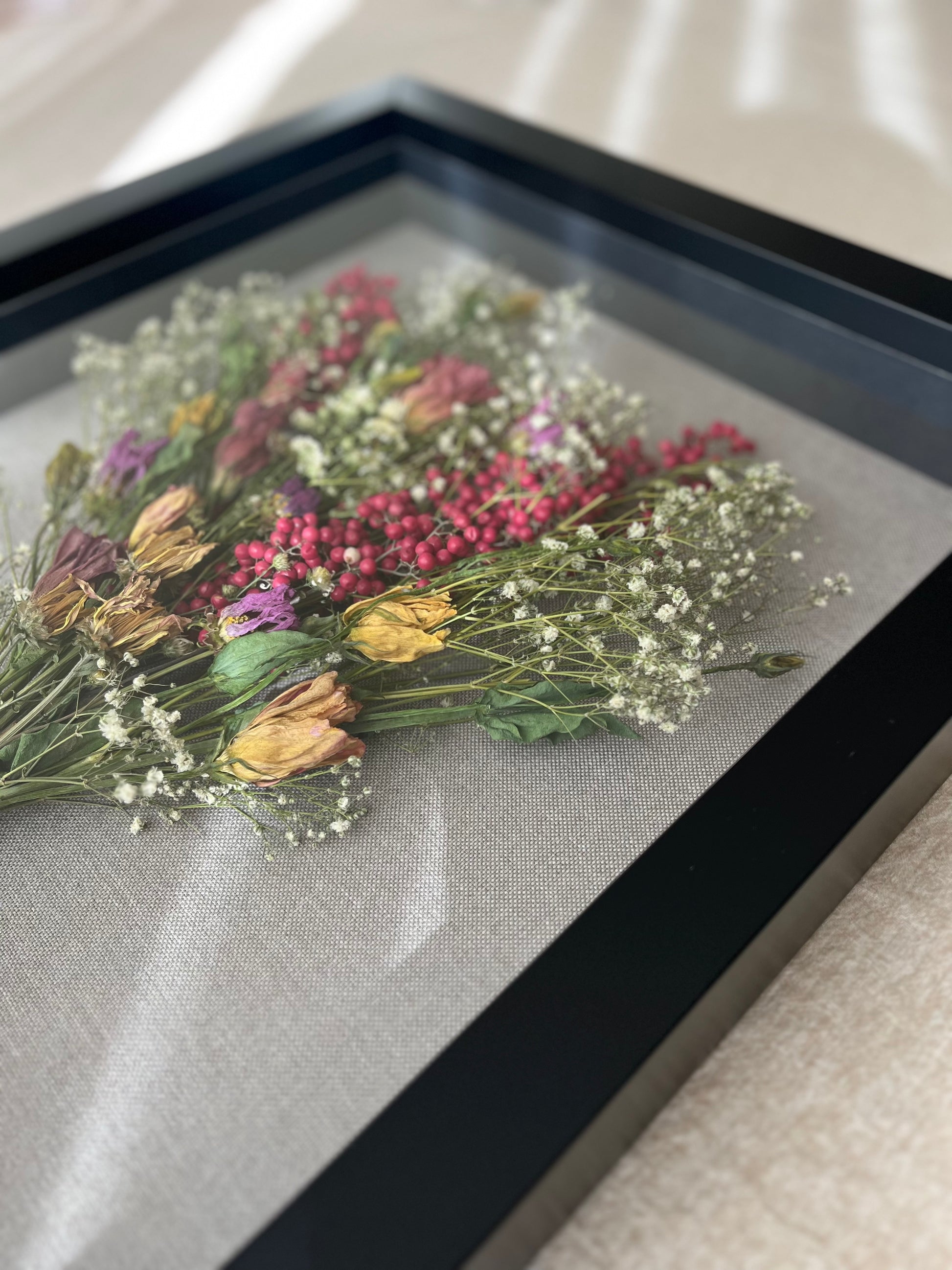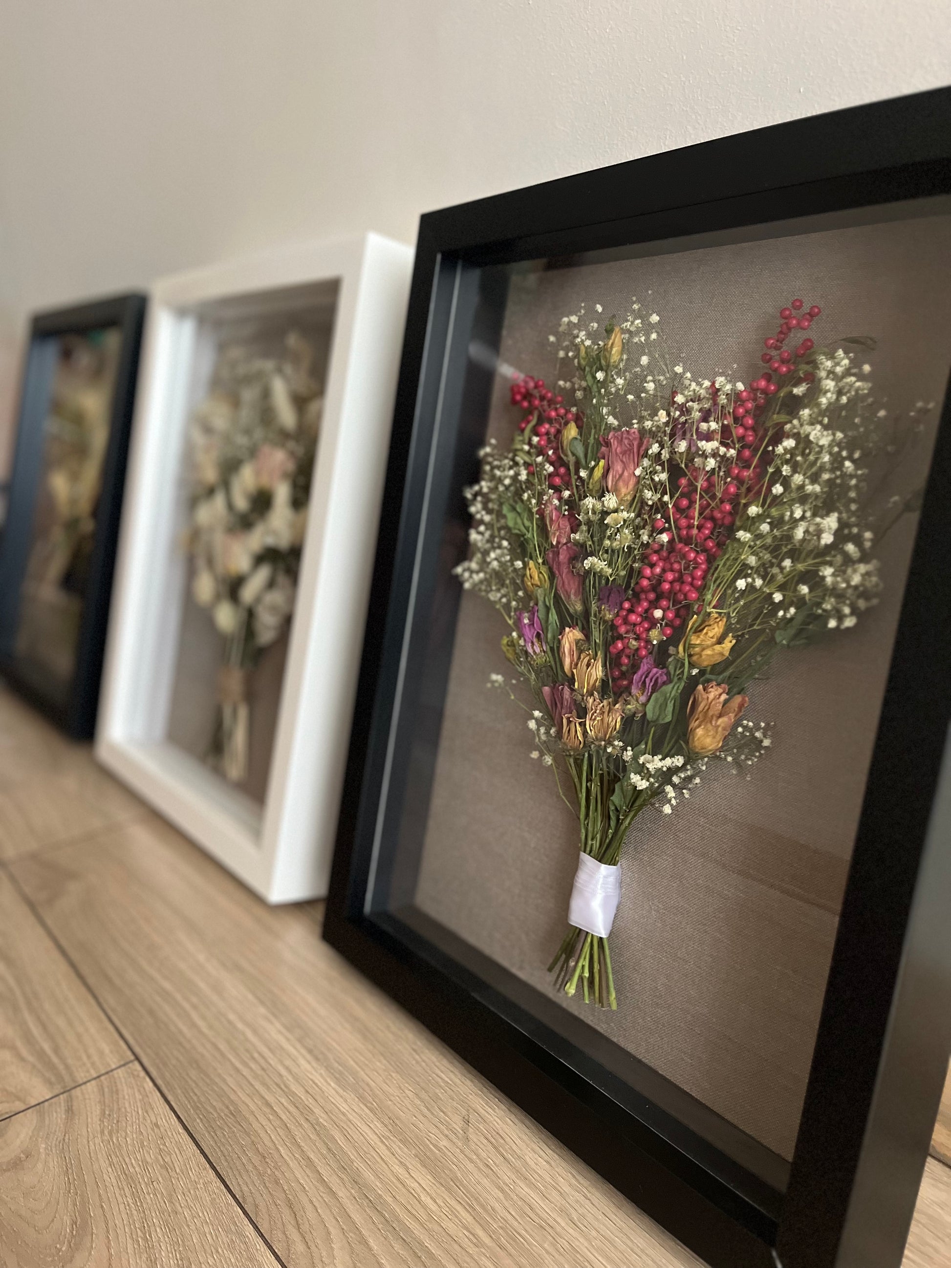 Nos demoramos aproximadamente 1 mes a un 1 y medio en secar y enmarcar tu ramo.