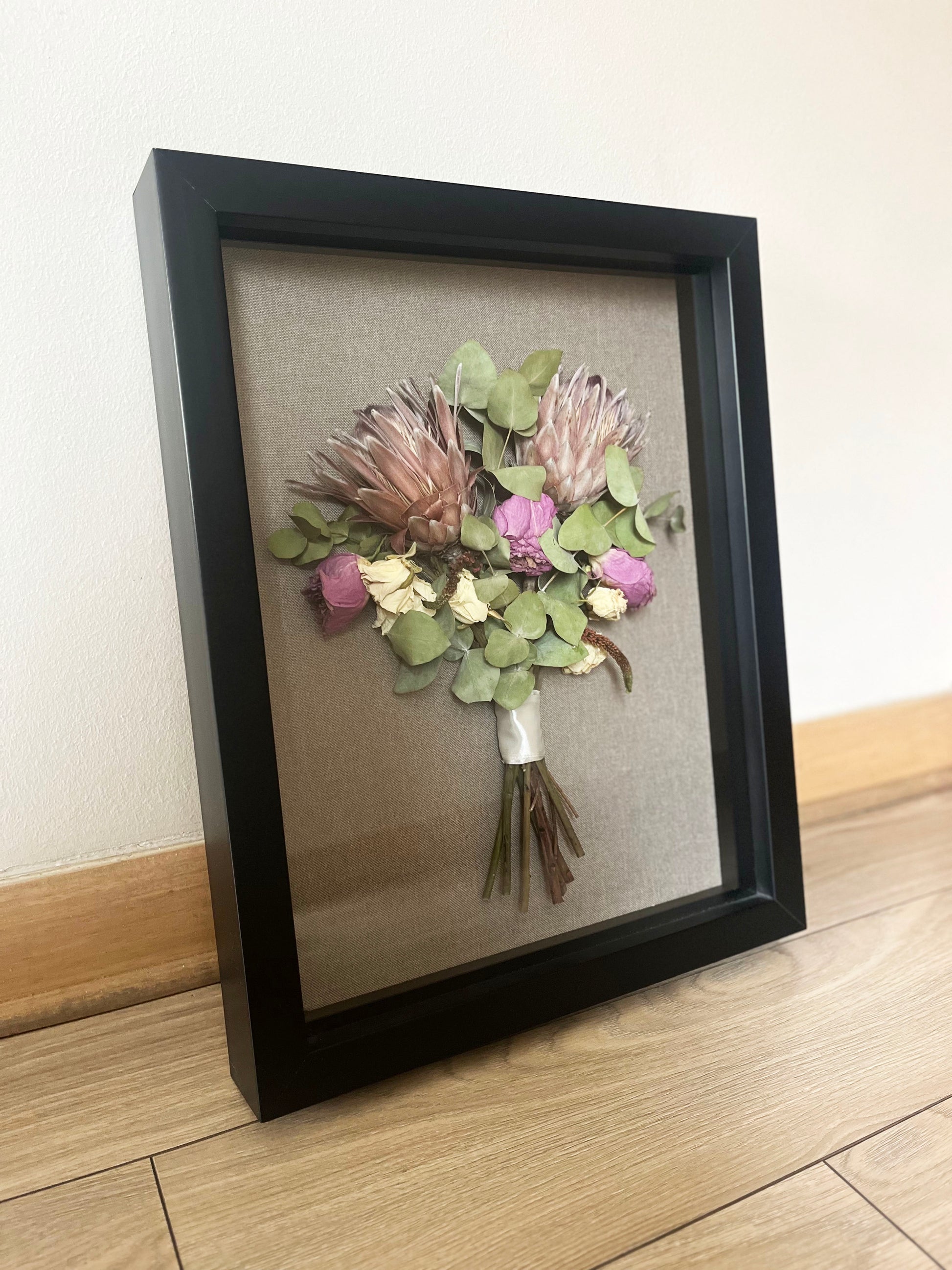 Nos demoramos aproximadamente 1 mes a un 1 y medio en secar y enmarcar tu ramo.